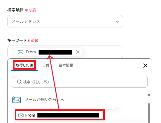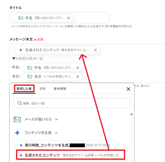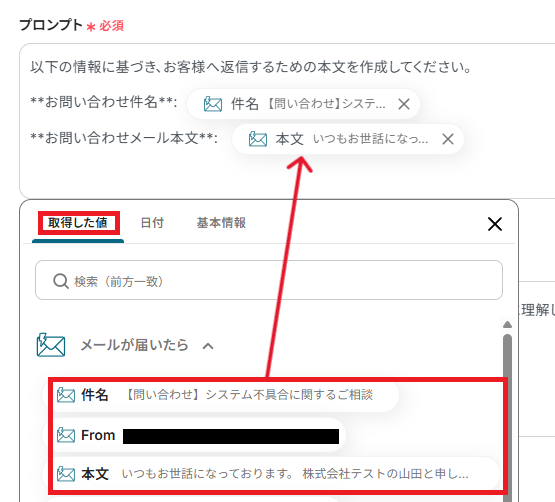 「プロンプト」は、メールから取得した値を活用し設定してください。 取得した値を活用することで、固定値ではなく、トリガーが実行されるたびに最新の情報が反映されます。