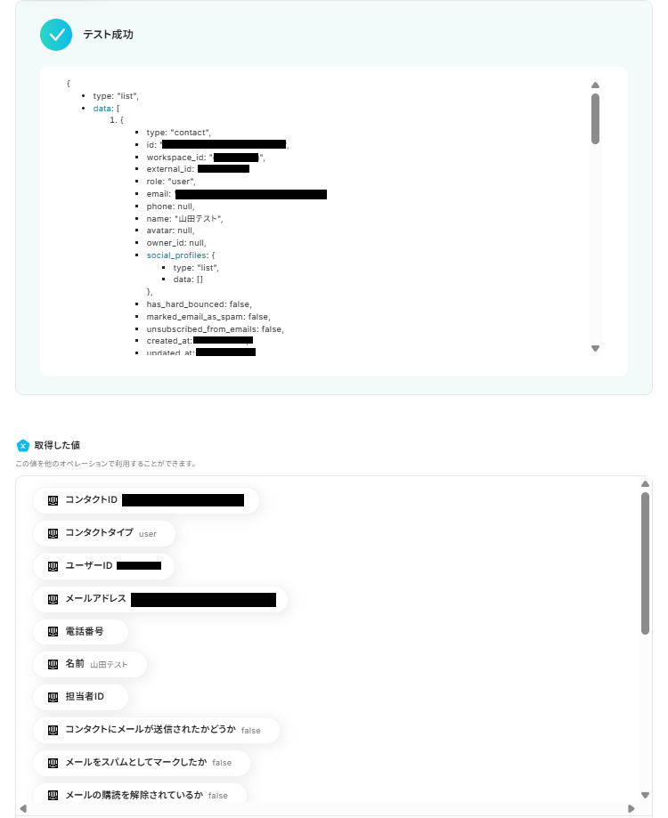テストが成功すると、下記のような取得した値が表示されるはずです。 取得した値はこのあとの設定でも使用します。