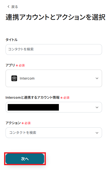 再度、Intercomと連携するアカウントに間違いがないかを確認し、「次へ」をクリックしましょう。