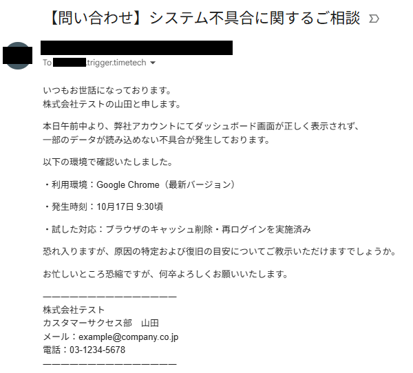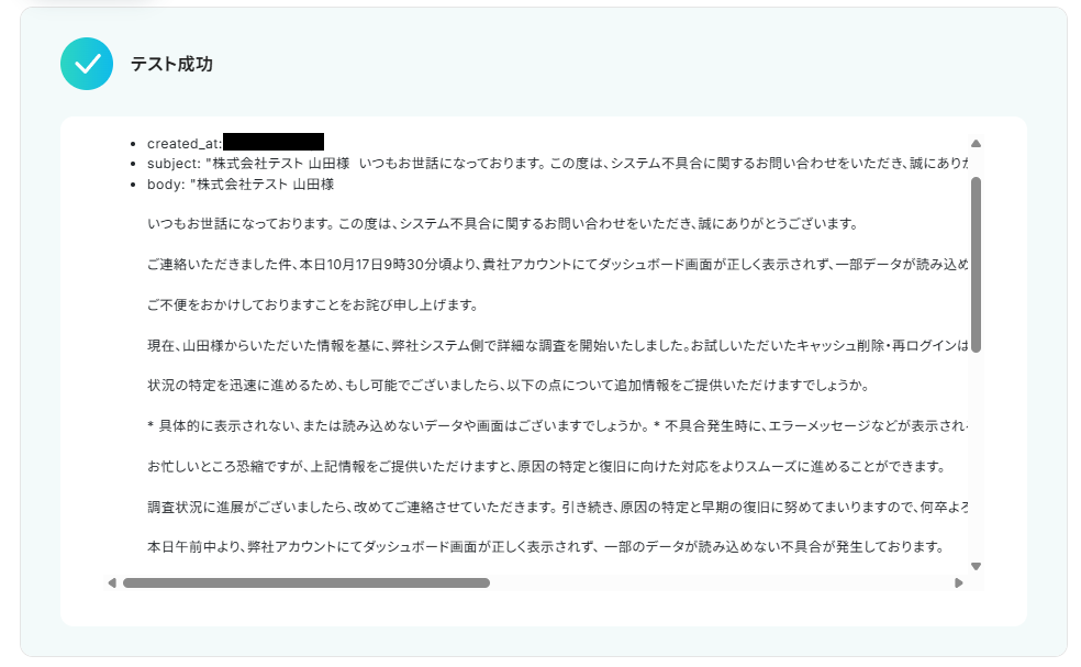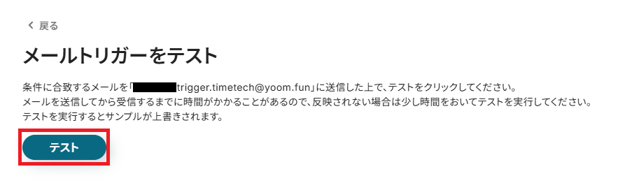 次の画面で、テストを行います。 トリガー条件に合うメールを、「受信用アドレスの作成」に入力した【~~~~~@trigger.timetech@yoom.fun】宛に送信してみましょう。 作成する内容は、架空の情報(「テスト会社」や「山田テスト」など)でOKです。