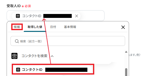 「受取人ID」は、コンタクト検索のアクションで取得したIDを設定します。