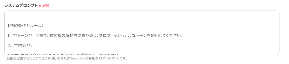 「システムプロンプト」は、AIに対して期待される動作や振る舞いを指示するものです。 詳細に設定することで、より意図に沿った返答の生成が可能です。 デフォルトで指示文の例が入っていますが、必要に応じて任意の指示に変更することもできます。