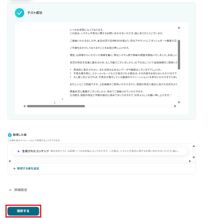 テストが成功すると、Geminiによって返答が生成されます。 内容を確認し、「保存する」をクリックしてください。