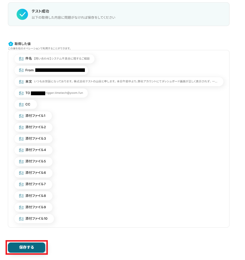 確認できたら、Yoomに戻り「保存する」を押してください。