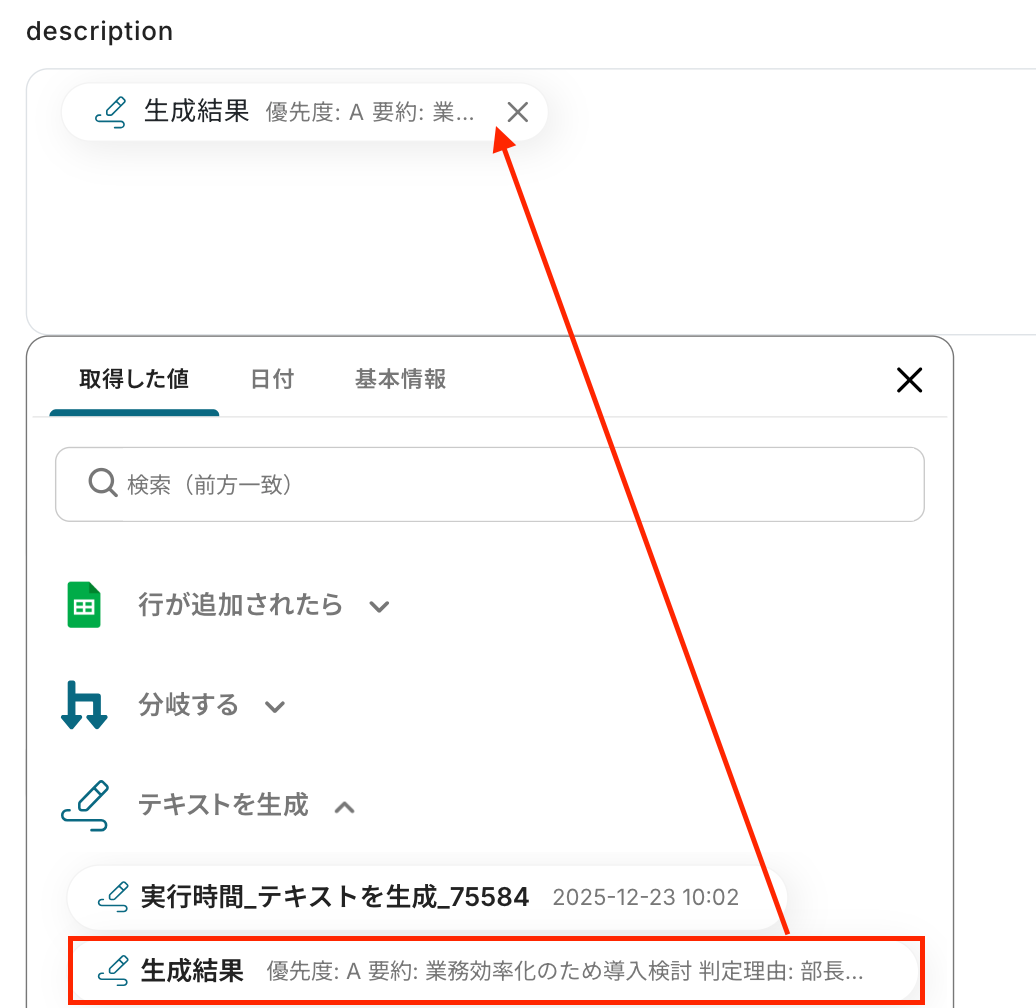 「description」では、タスクの説明を設定します。 「テキストの生成」で取得した値を設定しましょう。 Google スプレッドシートのトリガー設定で取得した値を挿入するなど、自由にカスタマイズして設定してください。
