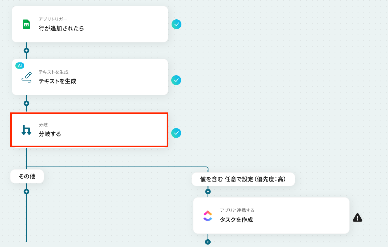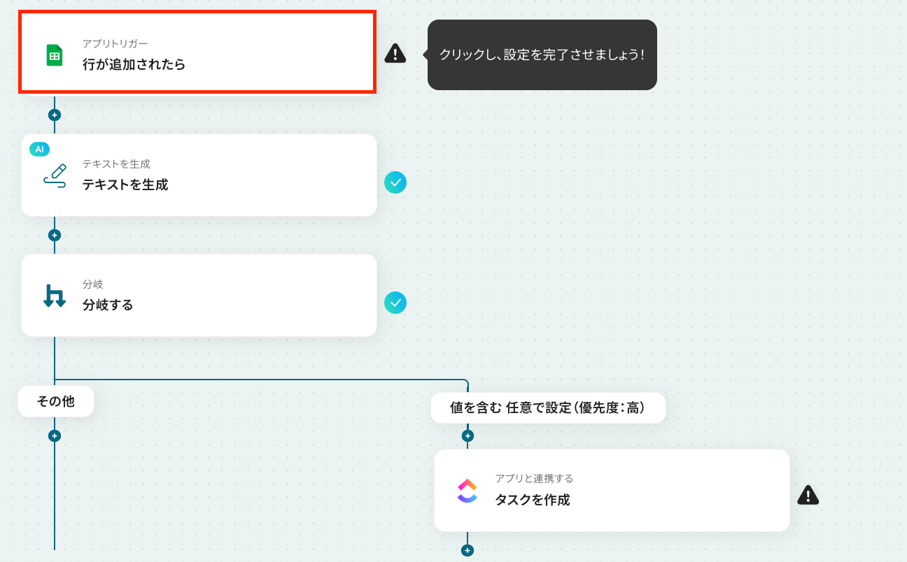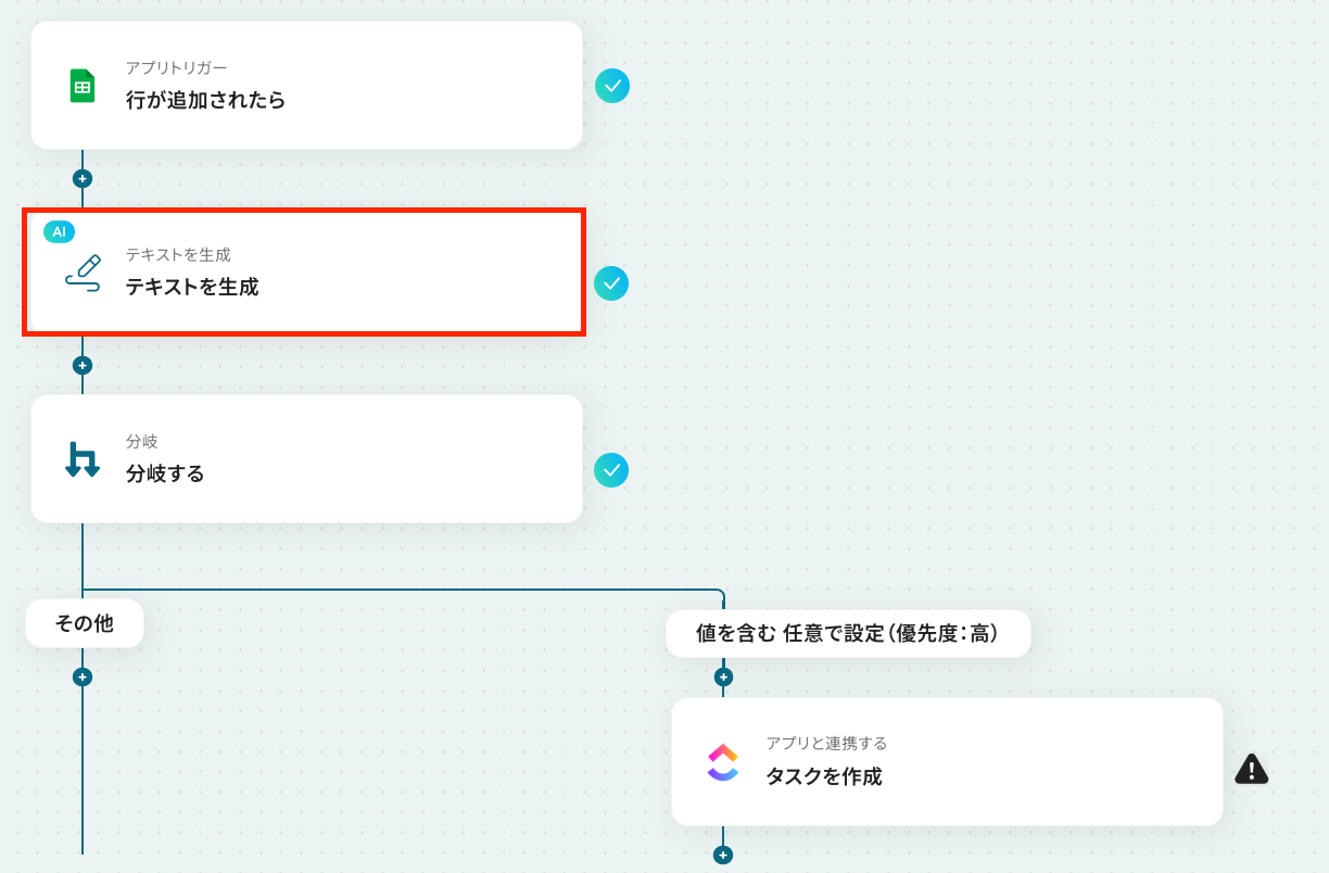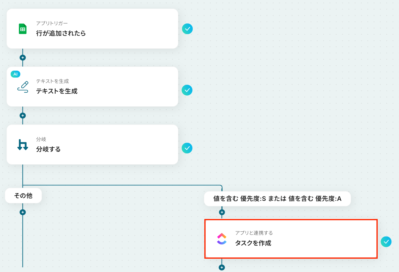 Google スプレッドシートのトリガー設定では、対象としたい任意のスプレッドシートIDやシート名を設定してください。 AI機能のテキスト生成では、スプレッドシートから取得したリード情報を引用し、自社の基準に合わせた優先度判定のプロンプトを自由に設定できます。 分岐機能では、AIが判定した優先度などの情報をもとに、通知先や担当者を変更するなど、条件を自由にカスタマイズすることが可能です。 ClickUpでタスクを作成する際に、スプレッドシートから取得した情報やAIの判定結果を引用し、タスク名や説明欄などのフィールドに自由に設定できます。 ■注意事項