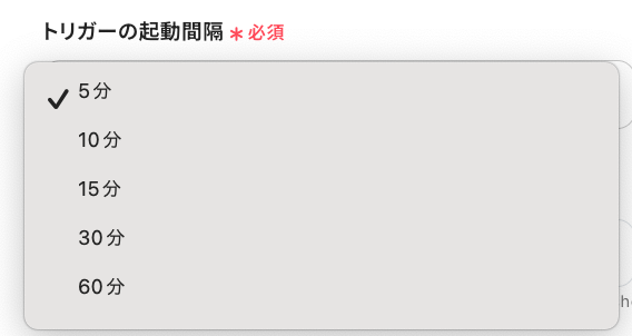 ・トリガーは5分、10分、15分、30分、60分の間隔で起動間隔を選択できます。