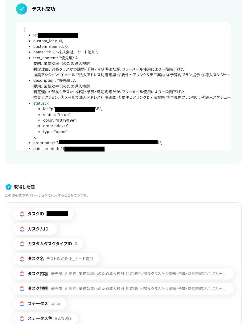 最後にClickUpでタスクが作成されたかを確認します。 確認できたら、以上で「Google スプレッドシートにリードが追加されたら、AIで優先度を判定してClickUpにタスクを追加する」 フローボットの完成です!お疲れ様でした。