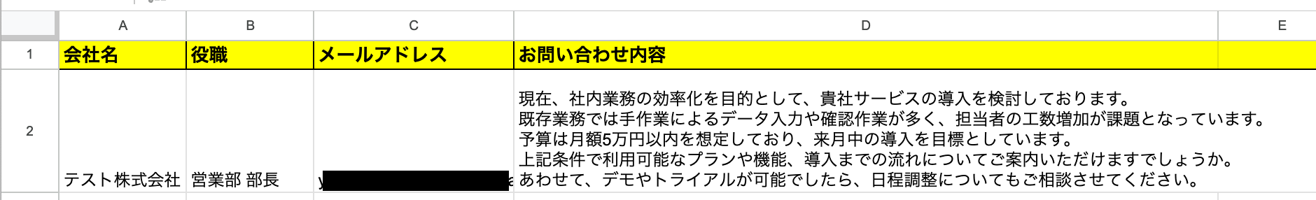 ここで、Google スプレッドシートの画面に移り、今回使用するシートを用意します。 今回は以下のシートを用意しました。
