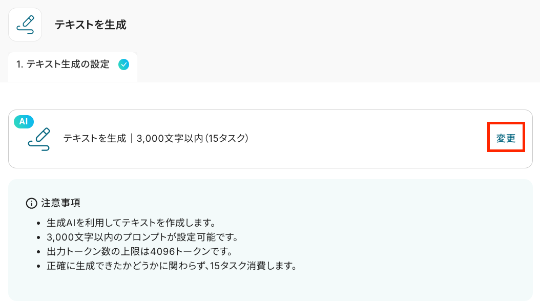以下の画面が表示されるので、注意事項を確認しましょう。 赤枠部分の「変更」をクリックすると、「指示可能なプロンプトの文字数」 を変更できます。 詳しくは以下をご確認ください。