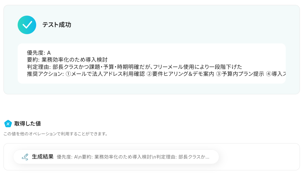 設定が完了したら、テストを行いましょう! テストに成功すると、取得した値を取得できます。 ※取得した値 とは? トリガーやオペレーション設定時に、「テスト」を実行して取得した値のことを指します。 後続のオペレーション設定時の値として利用でき、フローボットを起動する度に変動した値となります。