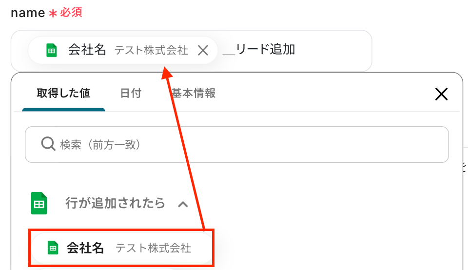 「name」では、タスクのタイトルを設定します。 ここでは「行が追加されたら」の取得した値を引用し、設定しました。