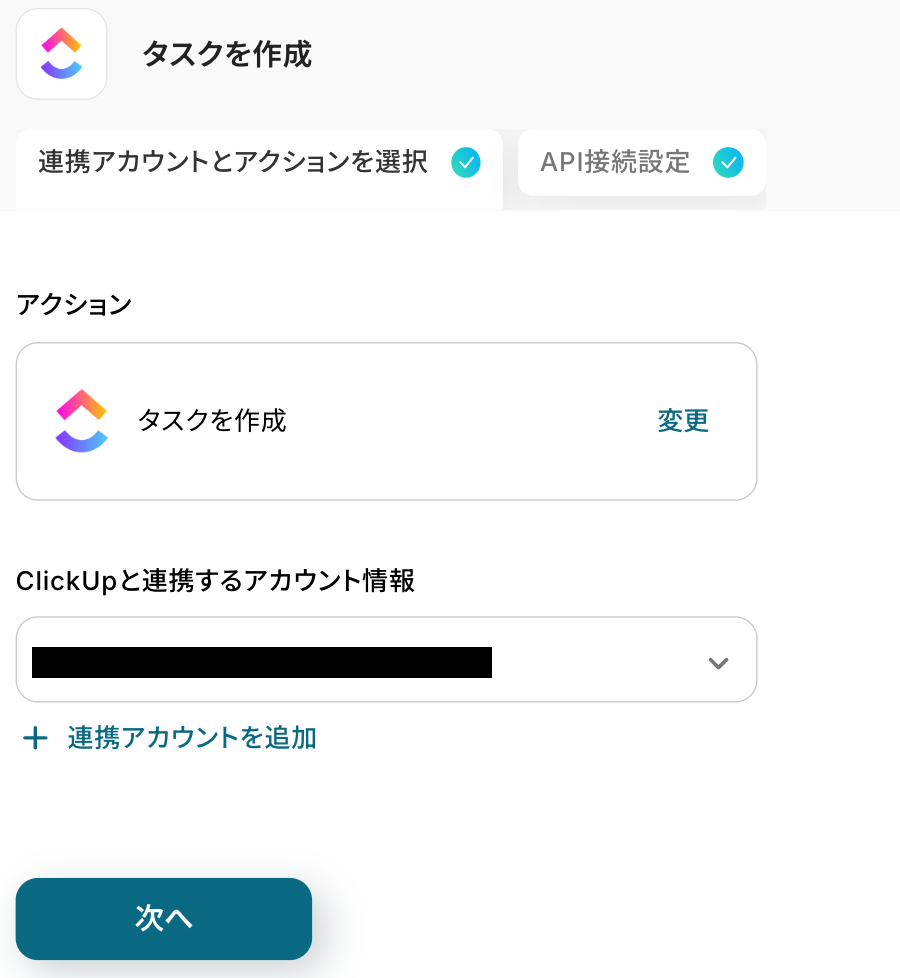 アクションは「タスクを作成」をクリックし、連携するアカウント情報を確認します。