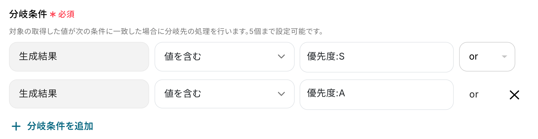 今回は、「生成結果」に「優先度:S」または「優先度:A」を含む場合に、次のオペレーションへ進むように設定しました。