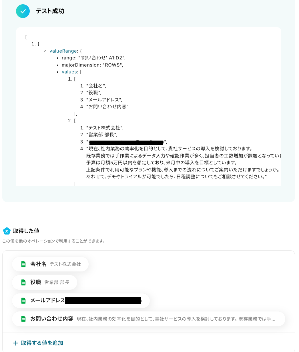 設定ができたら、「テスト」をクリックします。 テストが成功すると、取得した値が表示されます。 問題がなければ、「完了」をクリックしましょう!