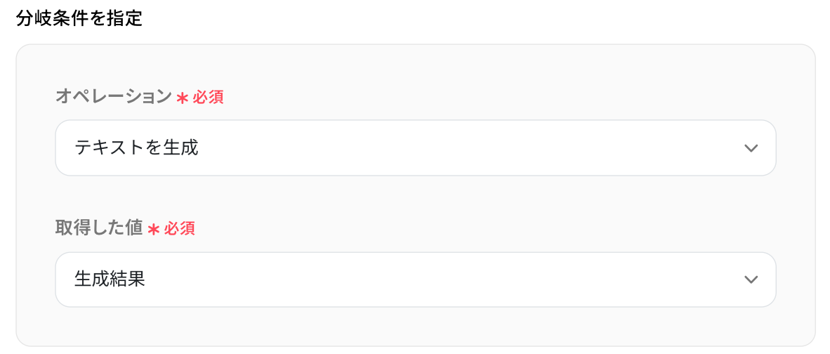 次の画面で、分岐条件を指定していきます!「オペレーション」 は、「テキストを生成」を選択してください。「取得した値」 は、先ほどのステップで取得した「生成結果」を設定しましょう!