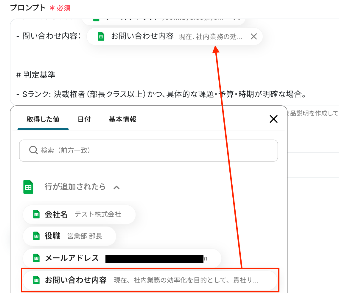 ここでは、AIでテキストを生成する際に使用するプロンプトを設定します。 今回はテンプレートを使用しているため既に設定されていますが、自由に設定することも可能です。 先ほど取得した値を組み合わせて設定してください。 取得した値は、入力欄をクリックすると表示されます!※「取得した値」は変数となるので、Google スプレッドシートでが追加される度に変動した値として使用することが可能です。