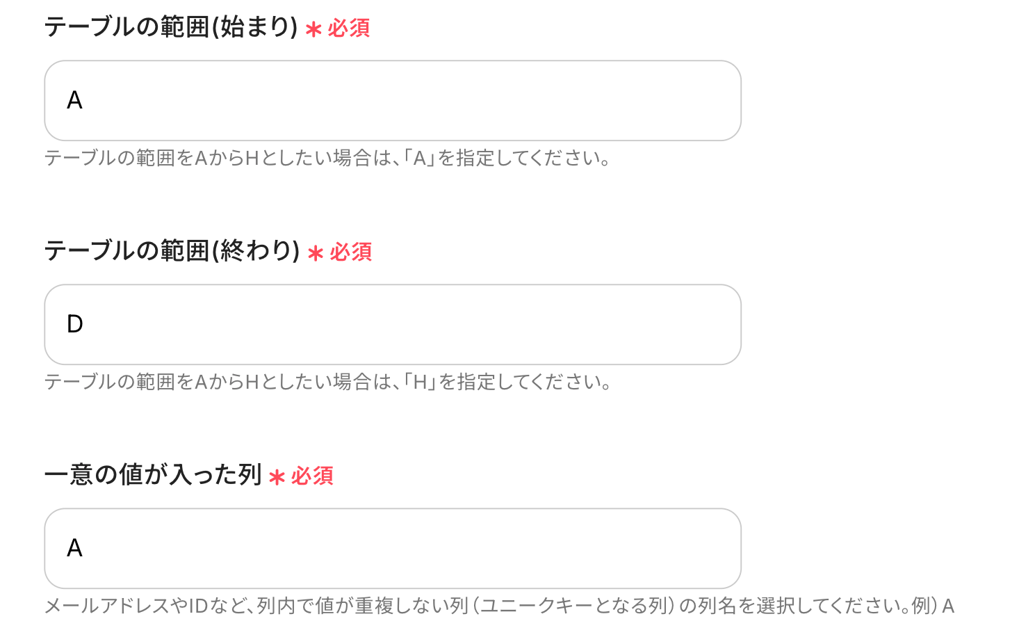 一意の値が入った列 :列内で値が重複しない列を選択。今回はA。※必ず値が重複しない列を選んでください!