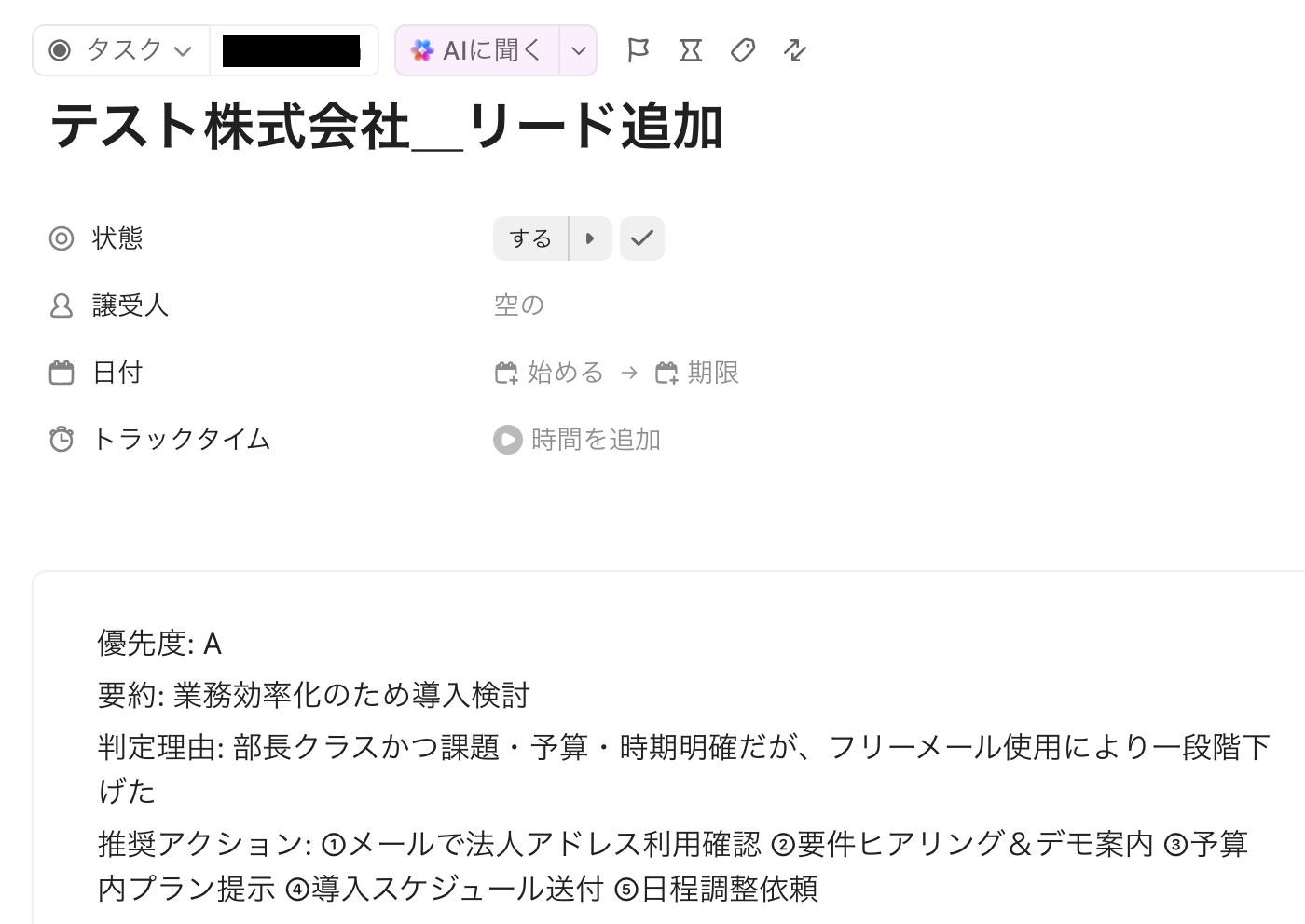 まとめ Google スプレッドシートとClickUpを連携し、AIによるリードの優先度判定を自動化することで、これまで属人的な判断に頼っていたり、手作業で行っていたりした優先順位付けとタスク登録の手間を削減し、ヒューマンエラーを防ぐことができます。