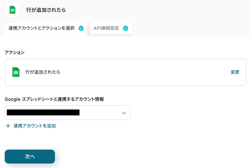 アクションはそのままで、アカウント情報が間違っていないか確認します。 「次へ」をクリックしましょう!