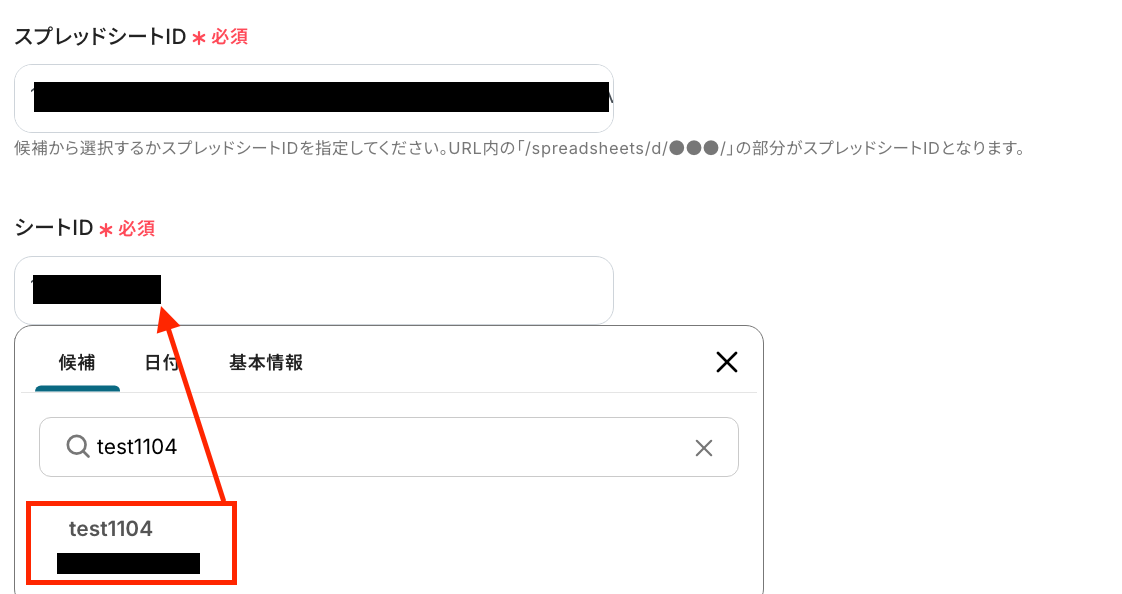 スプレッドシートID・シートID :入力欄をクリックして表示される「候補」から選択してください。