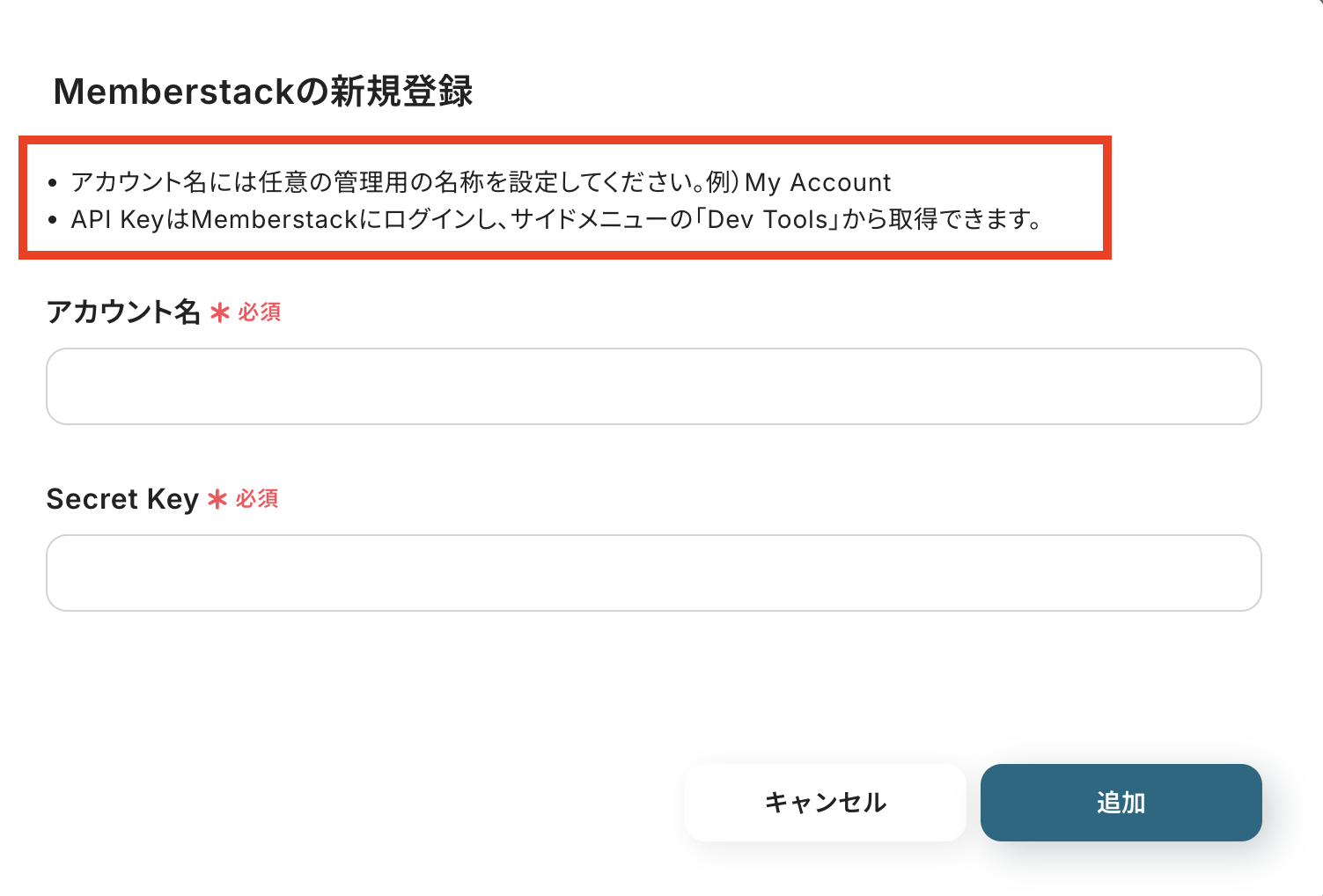 Memberstackを検索すると新規登録画面が表示されるので赤枠部分を確認しながら「アカウント名」と「Secret Key」を入力すると連携完了です。