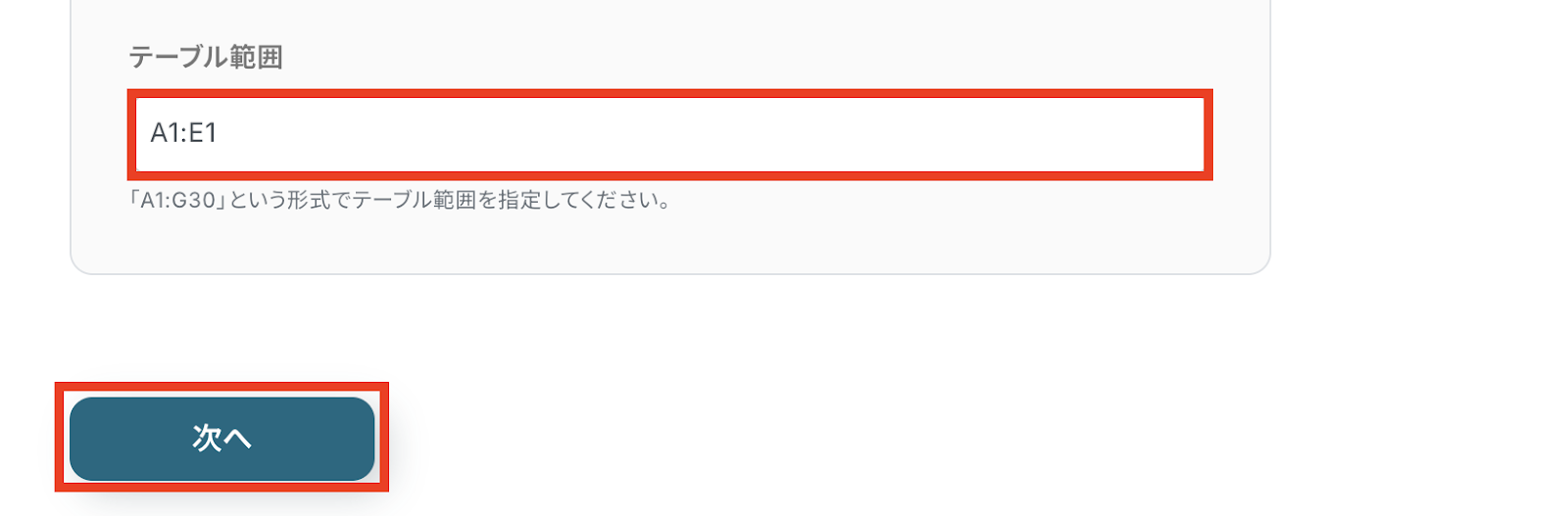 「テーブル範囲」は、連携するGoogle スプレッドシートに合わせて入力します。