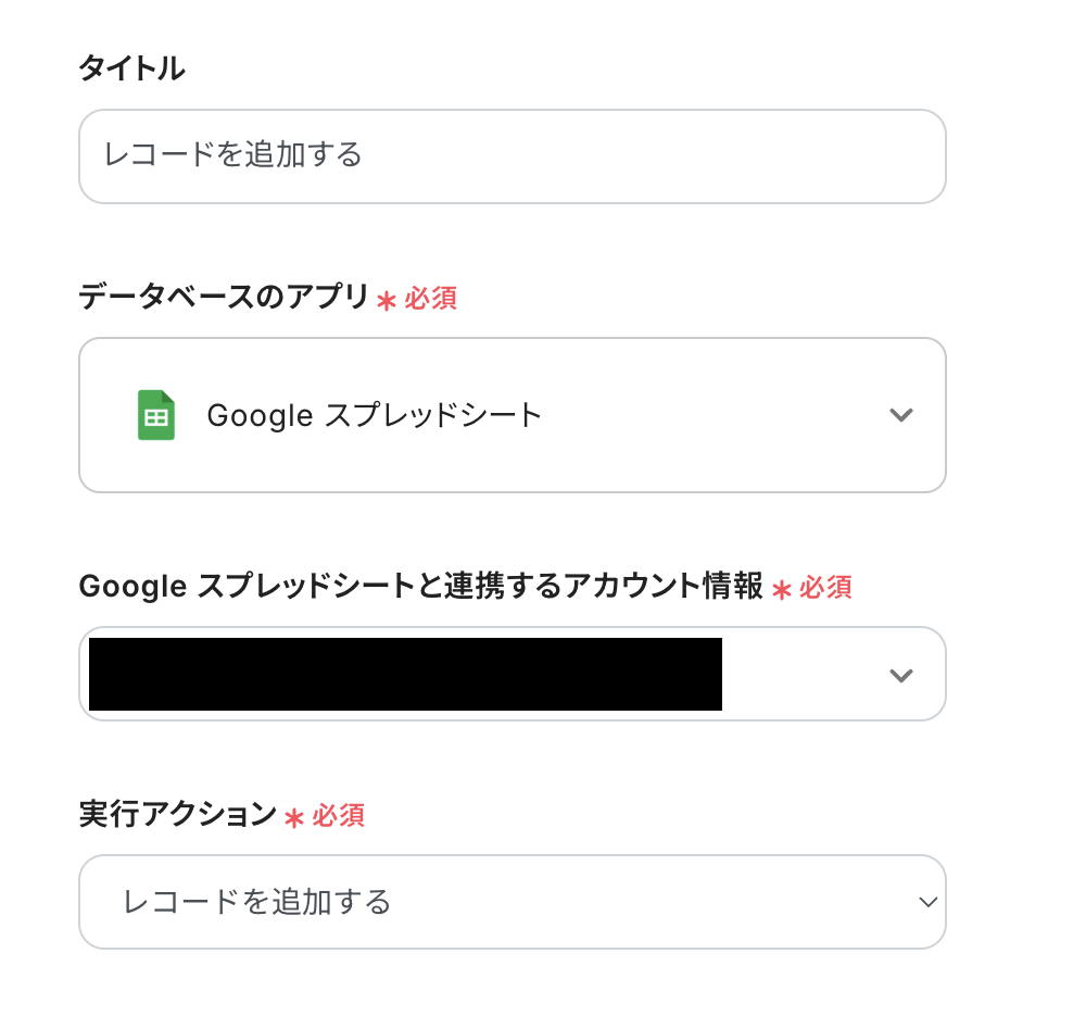 Google スプレッドシートの項目が表示されるので、項目ごとにステップ3で取得した値を活用して設定していきます。