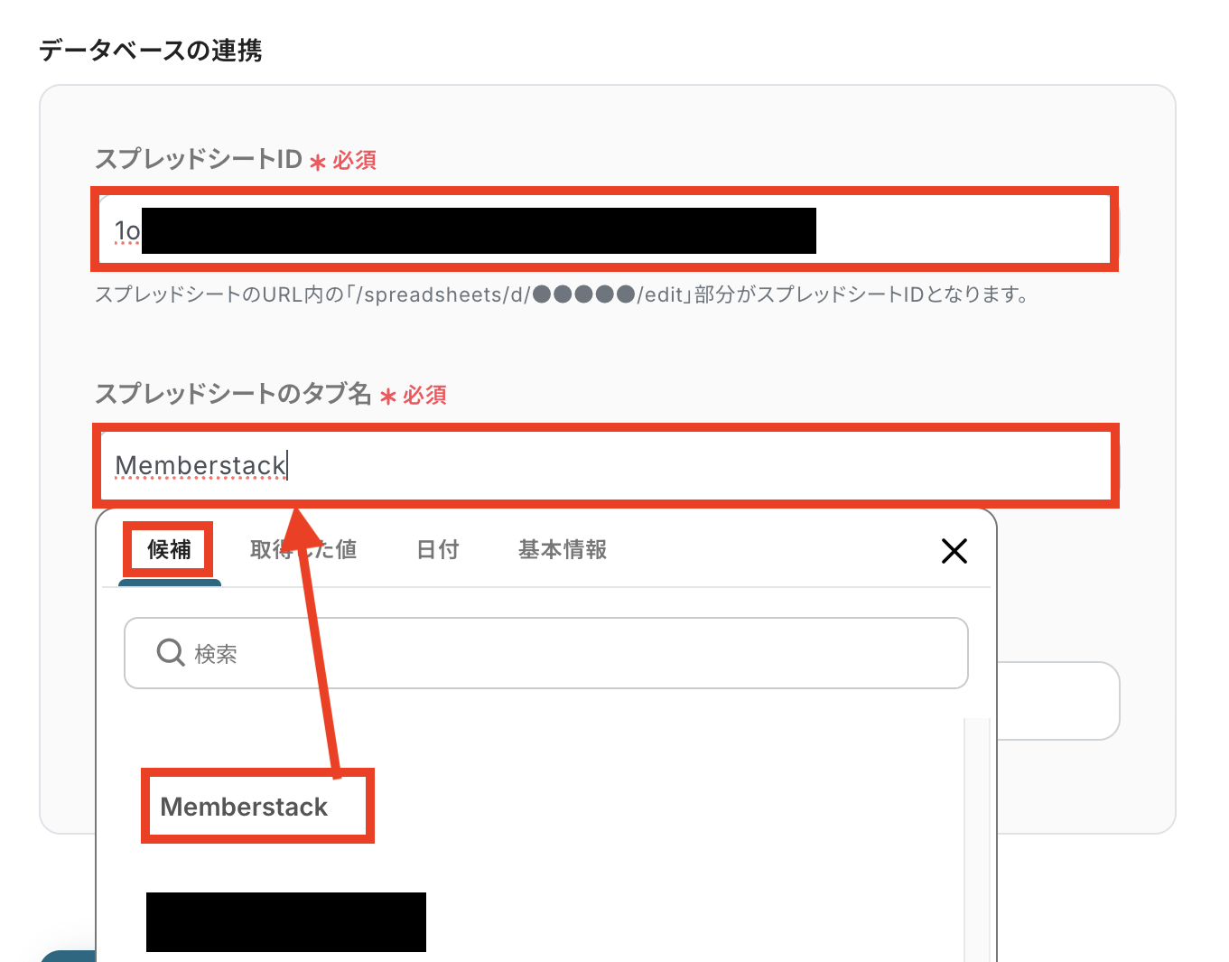 「スプレッドシートID」と「スプレッドシートのタブ名」は候補から選択できます。