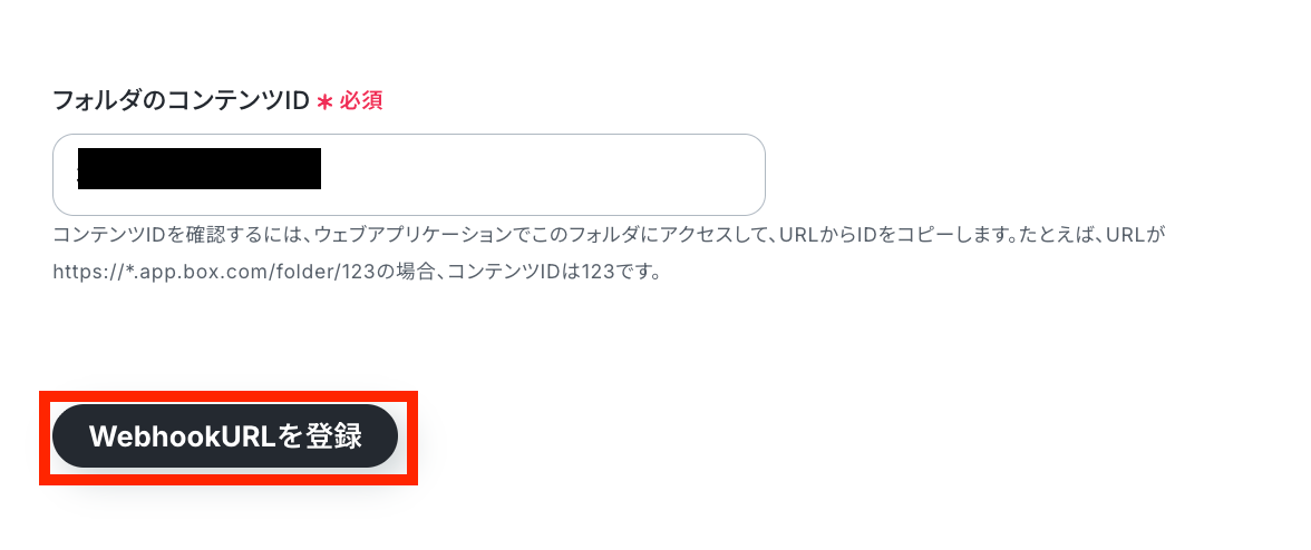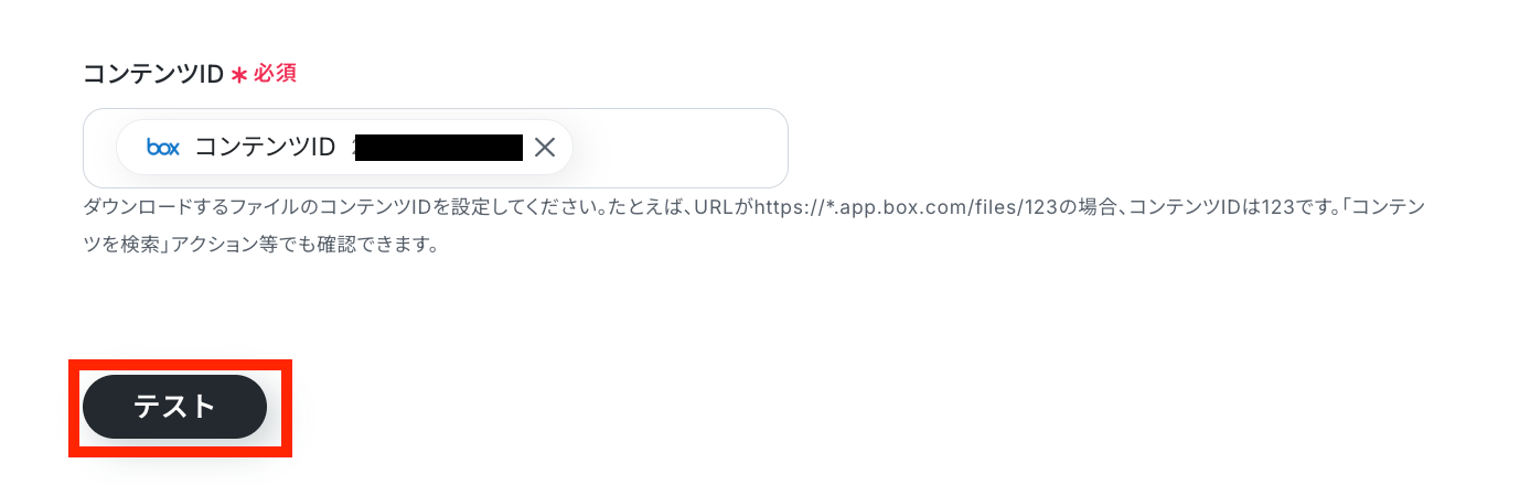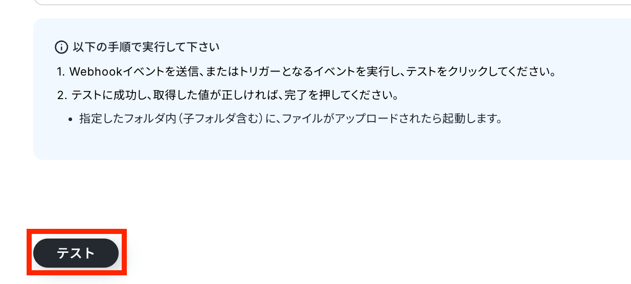 ファイルをアップロードするフォルダのコンテンツIDを手動で設定したら、「テスト」ボタンを押しましょう。 ※この時に指定するフォルダは、Yoomで使用していないフォルダを指定してください。 使用済みのフォルダを指定するとWebhookが重複するため、連携エラーの原因となります。