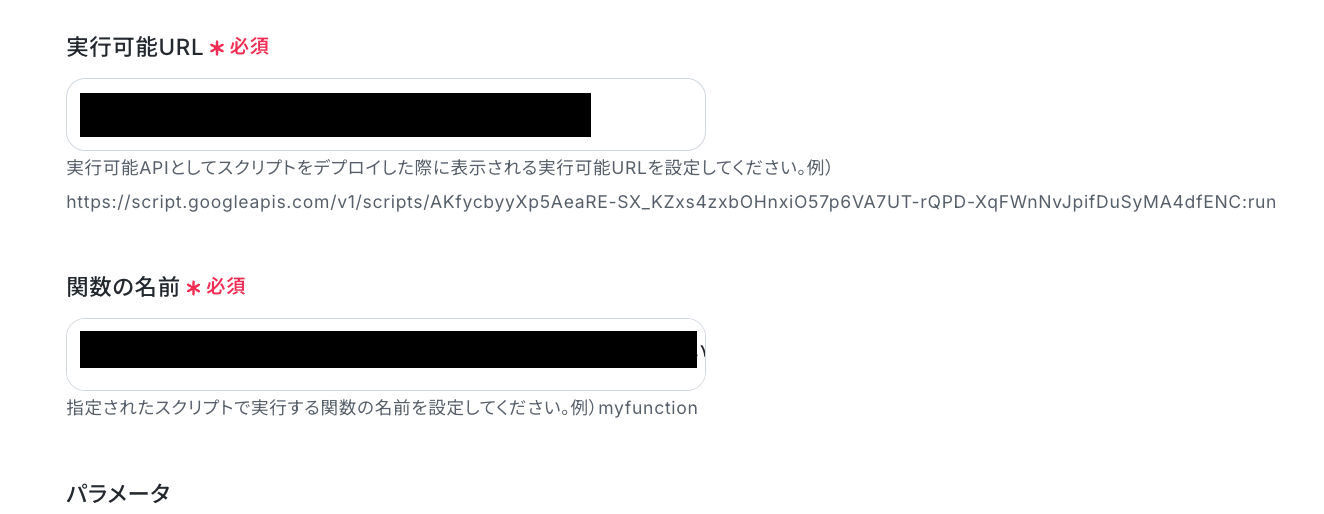 「実行可能URL」「関数の名前」は、入力欄下の説明に従って、入力してください!