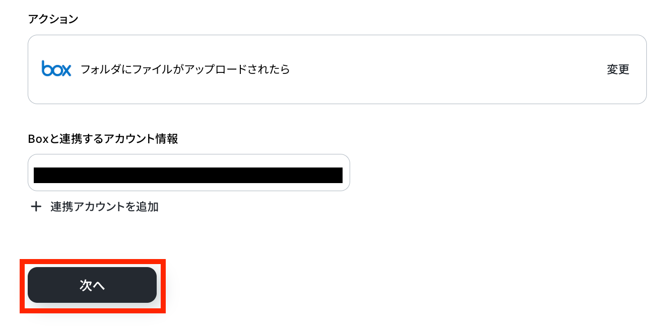 連携アカウントとアクションを選択しましょう。 トリガーアクションは、テンプレート通りに「フォルダにファイルがアップロードされたら」のままで大丈夫です。 「次へ」をクリックして進んでください。