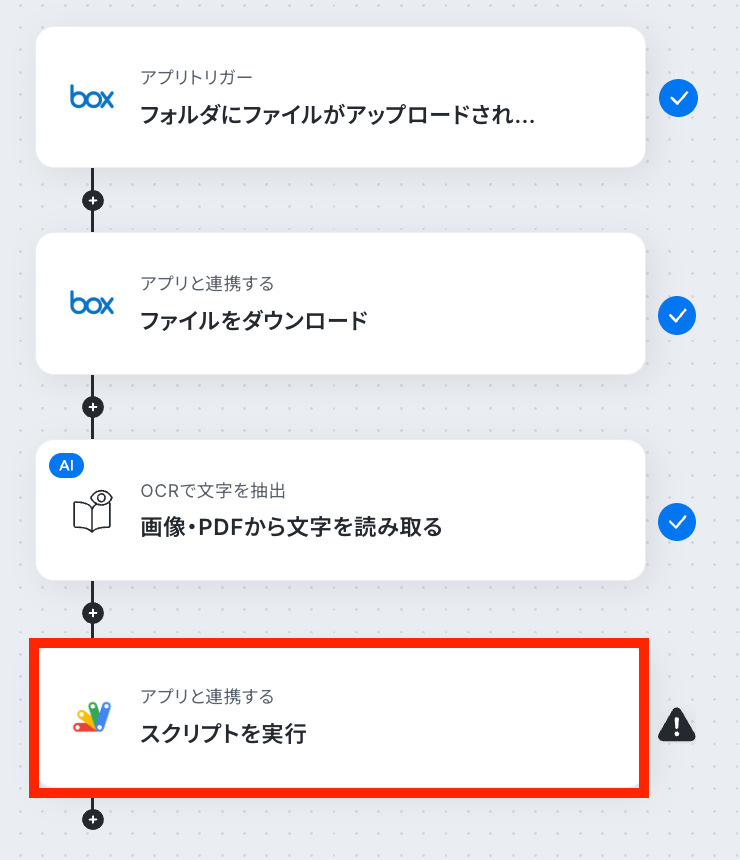 Boxのトリガー設定では、自動化の起点としたい特定のフォルダを任意で指定してください。 OCR機能では、どの部分のテキストを抽出するかといった項目を、業務内容に合わせて細かく設定できます。 Google Apps Scriptのオペレーションでは、前段階のOCR機能で取得したテキスト情報などを変数として、実行するスクリプトに動的に設定することが可能です。 ■注意事項