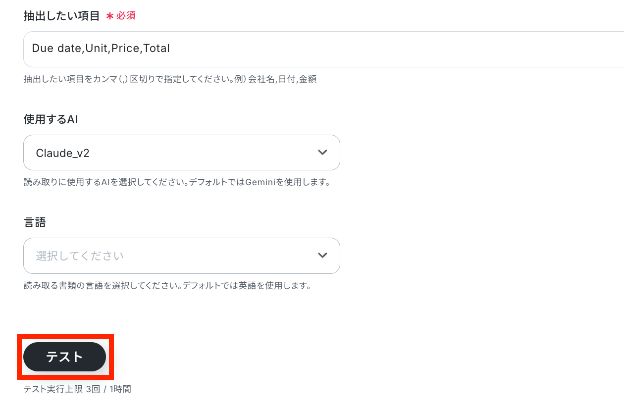 抽出したい項目を指定します。その他もに任意で設定が済んだら、テストを実行してみましょう!