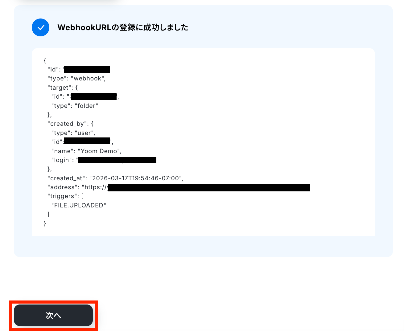 WebhookURLの登録成功を確認したら、「次へ」をクリックします。