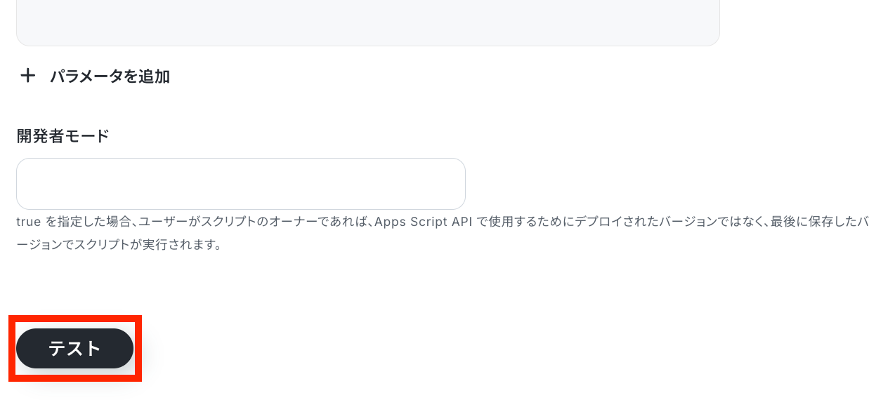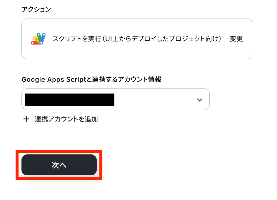 ステップ5:Google Apps Scriptのアクション設定 これまでのステップで取得した値を活用して、Google Apps Script上でスクリプトを実行します。 最後の赤枠をクリックしましょう!