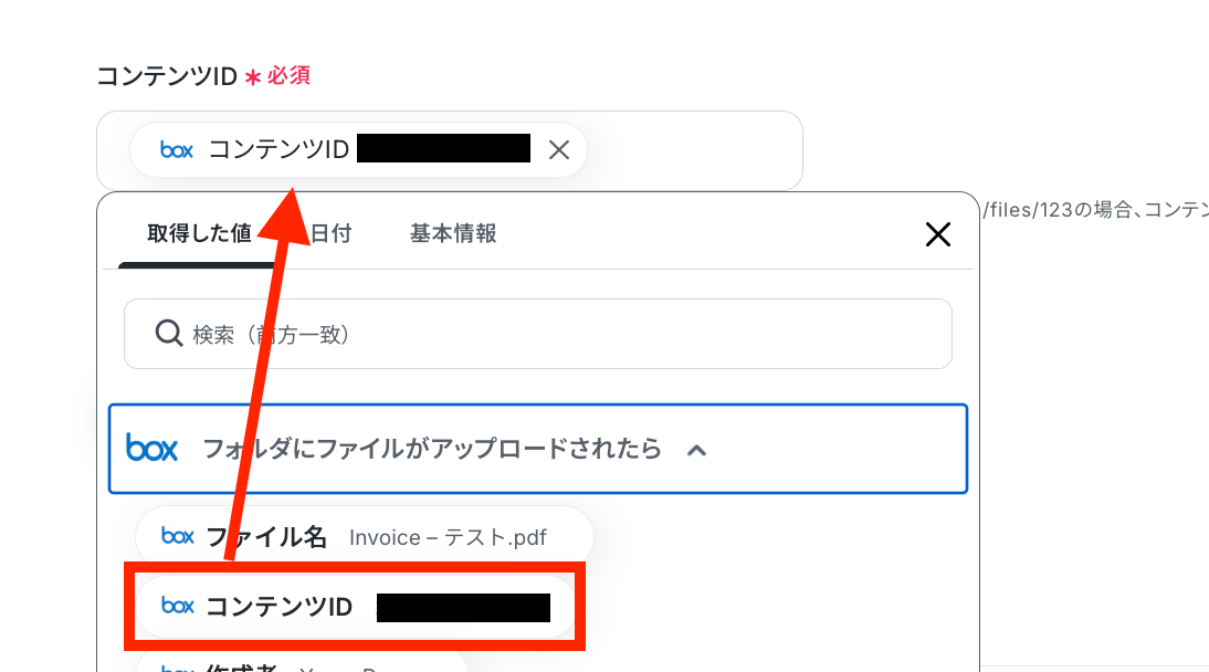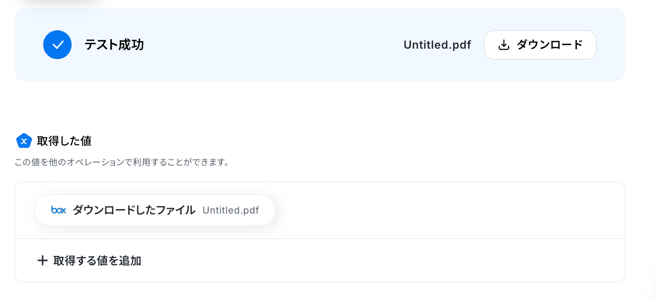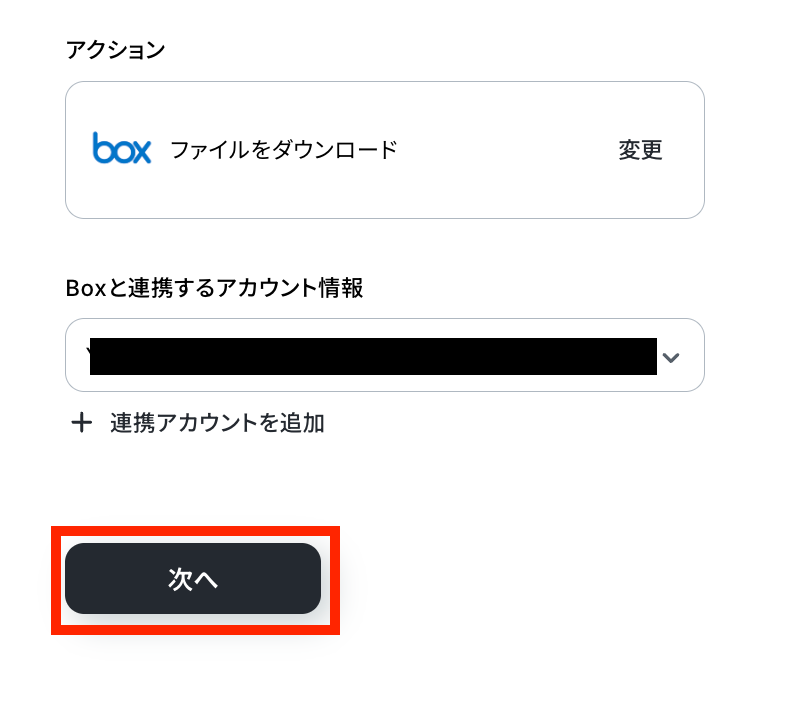 ステップ4:Boxのアクション設定 取得した値からBoxのファイルをダウンロードする設定を行います。2つ目の赤枠をクリックしましょう!