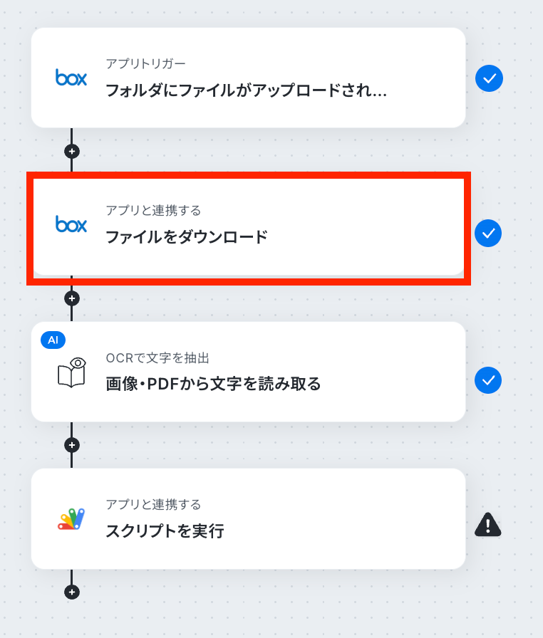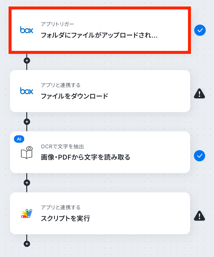 BoxとGoogle Apps Scriptを連携するフローを作ってみよう それではここから代表的な例として、BoxにファイルがアップロードされたらOCRで内容を読み取り、Google Apps Scriptでスクリプトを自動で実行するフローを解説していきます!