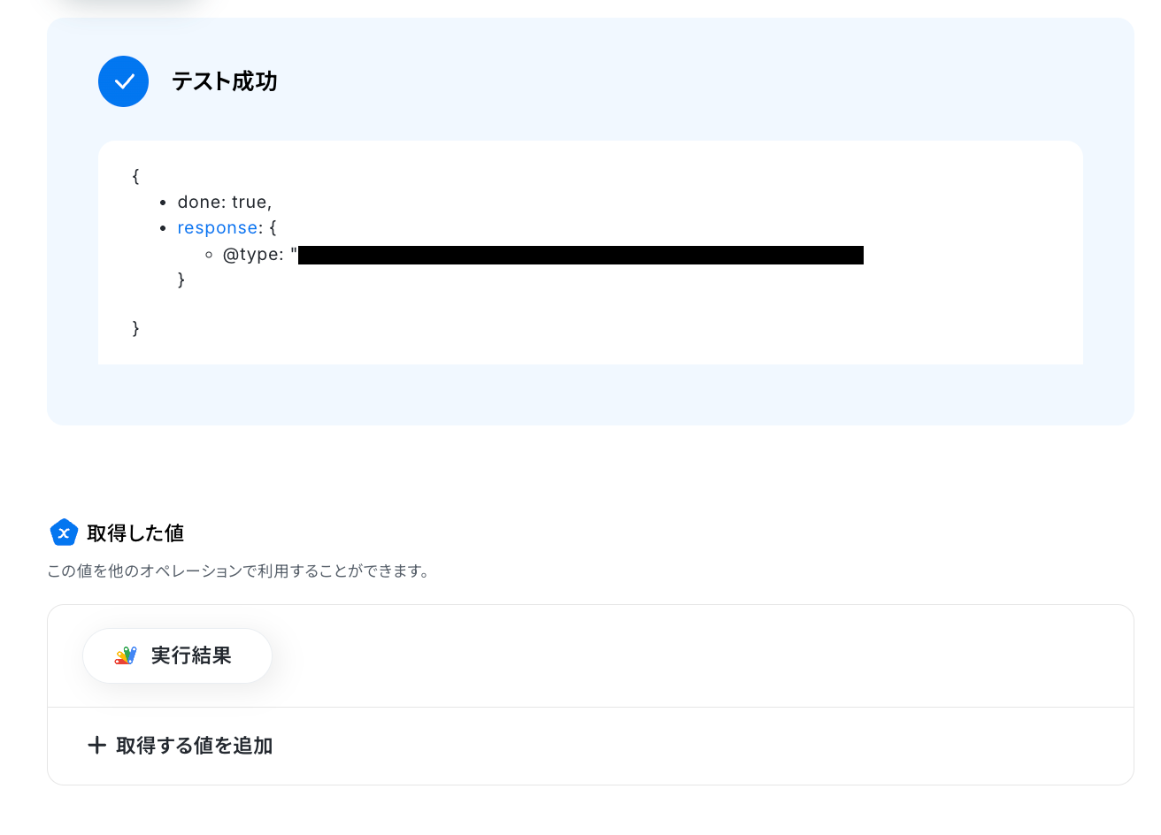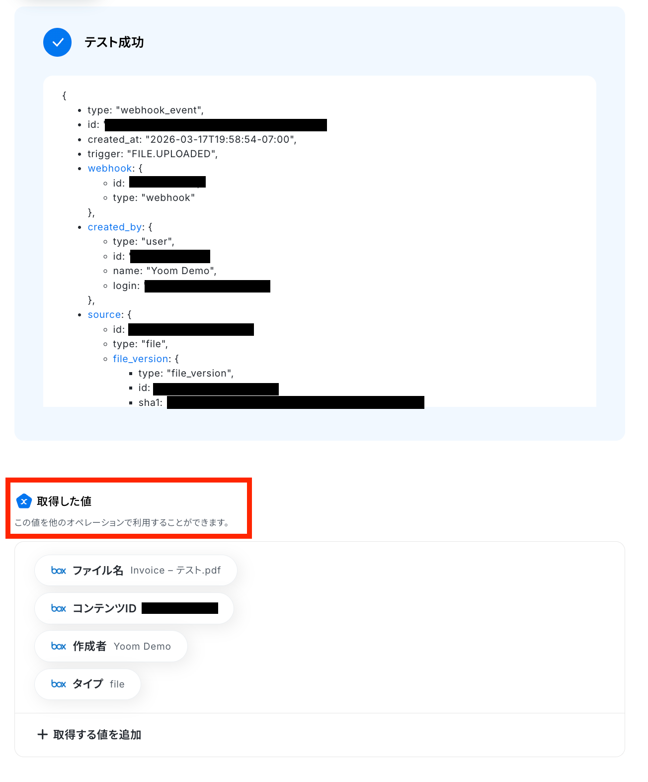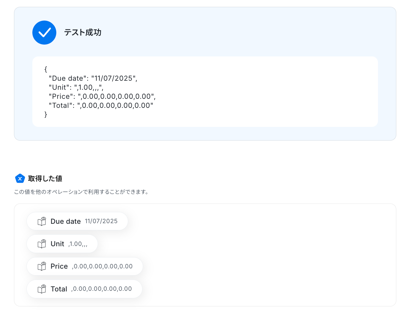 「テスト成功」と表示がされたら、抽出された項目が取得した値に反映されています。