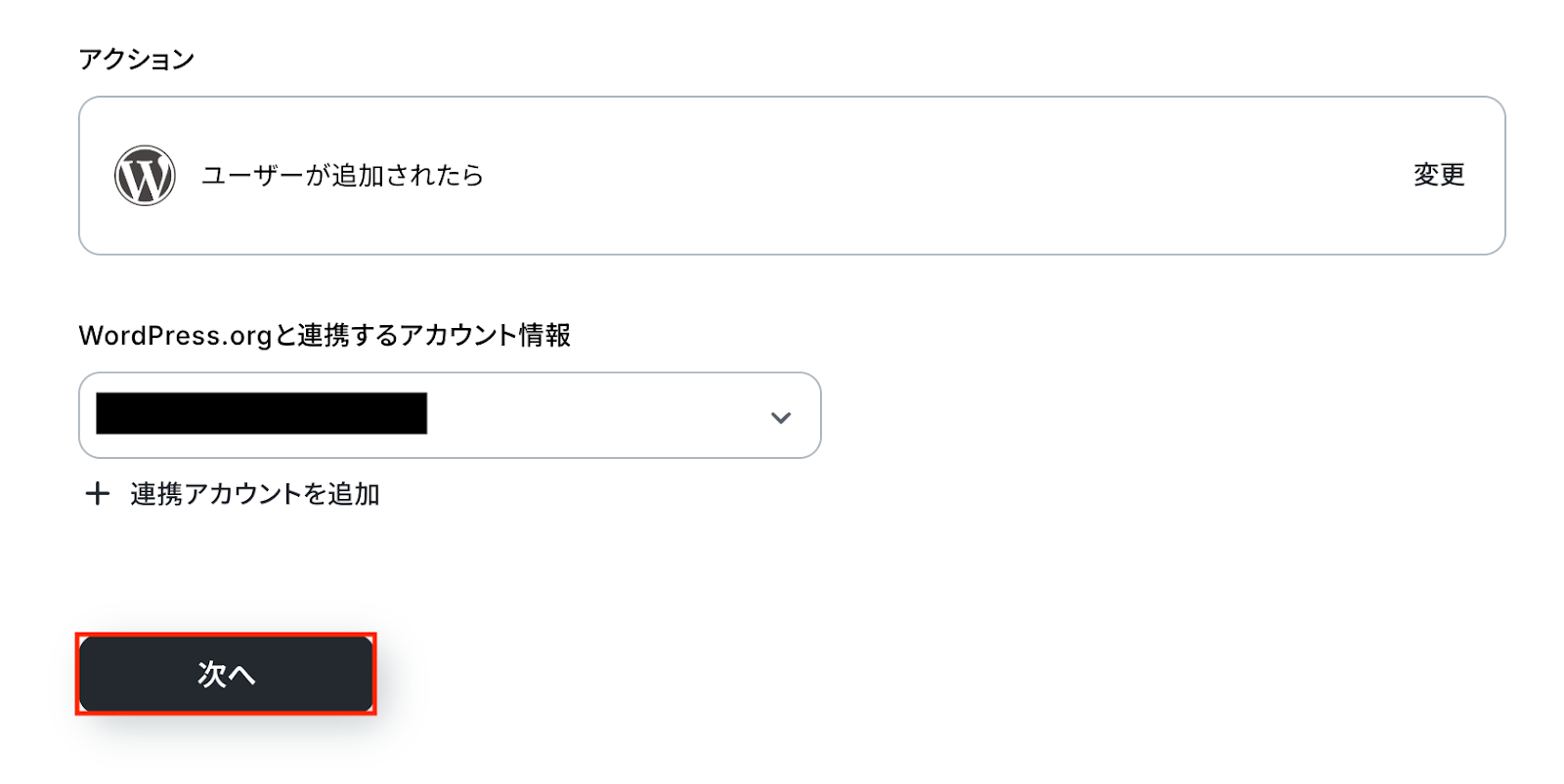 WordPress.orgと連携するアカウント情報に問題がなければ、「次へ」をクリックします。