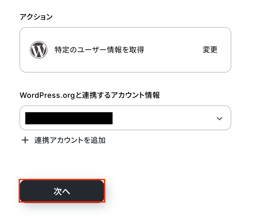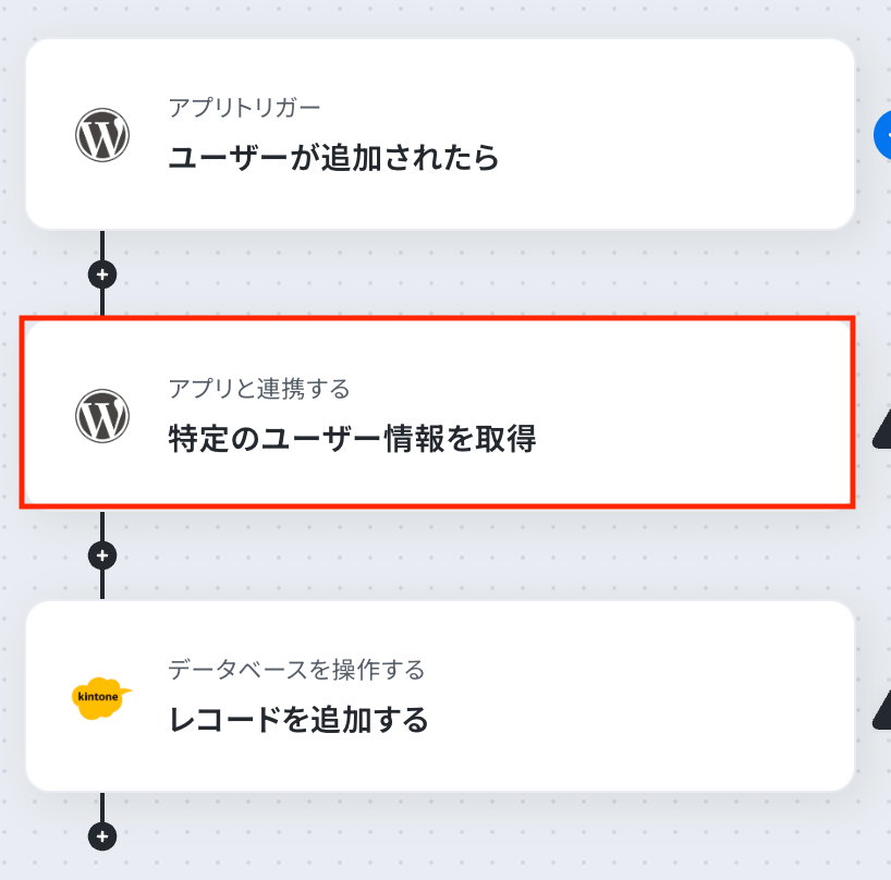 続いて、トリガーのステップでWordPress.orgから取得したユーザーについて、詳細情報を取得する設定を行いましょう。