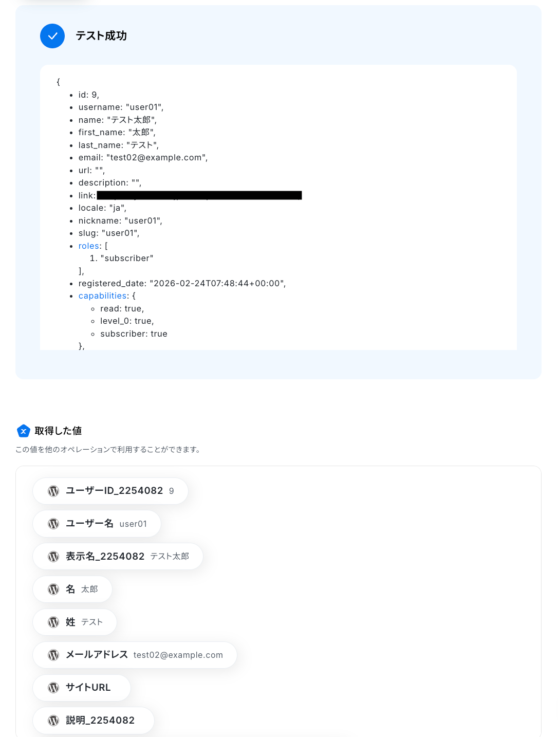 たとえば、WordPress.orgから取得した値から、「役割のリスト」が「subscriber」である場合のみ処理を進めるよう設定すれば、管理者や編集者といった内部ユーザーを除外し、購読者のみを通知・連携対象にすることが可能です。
