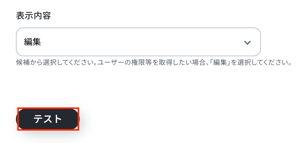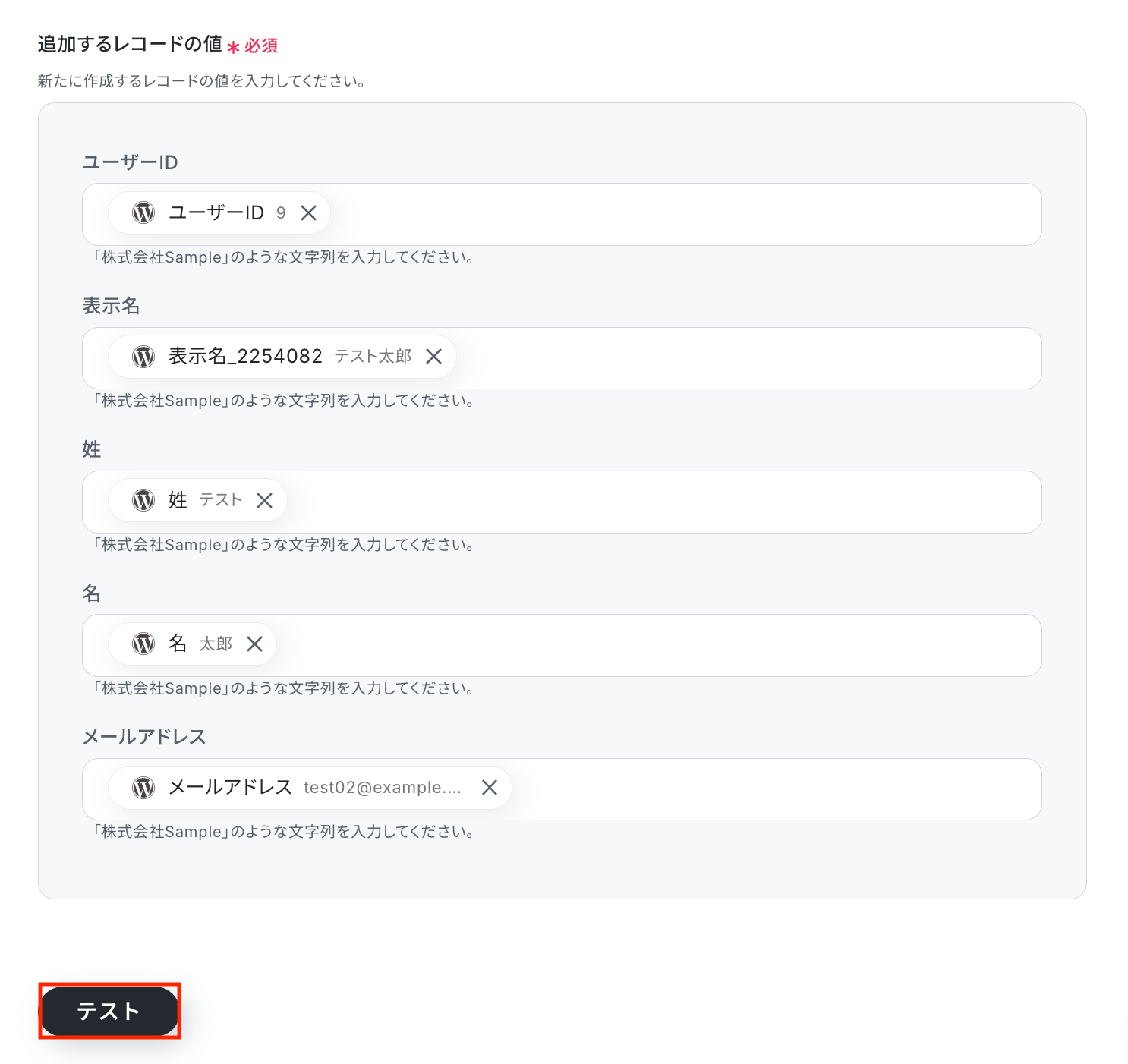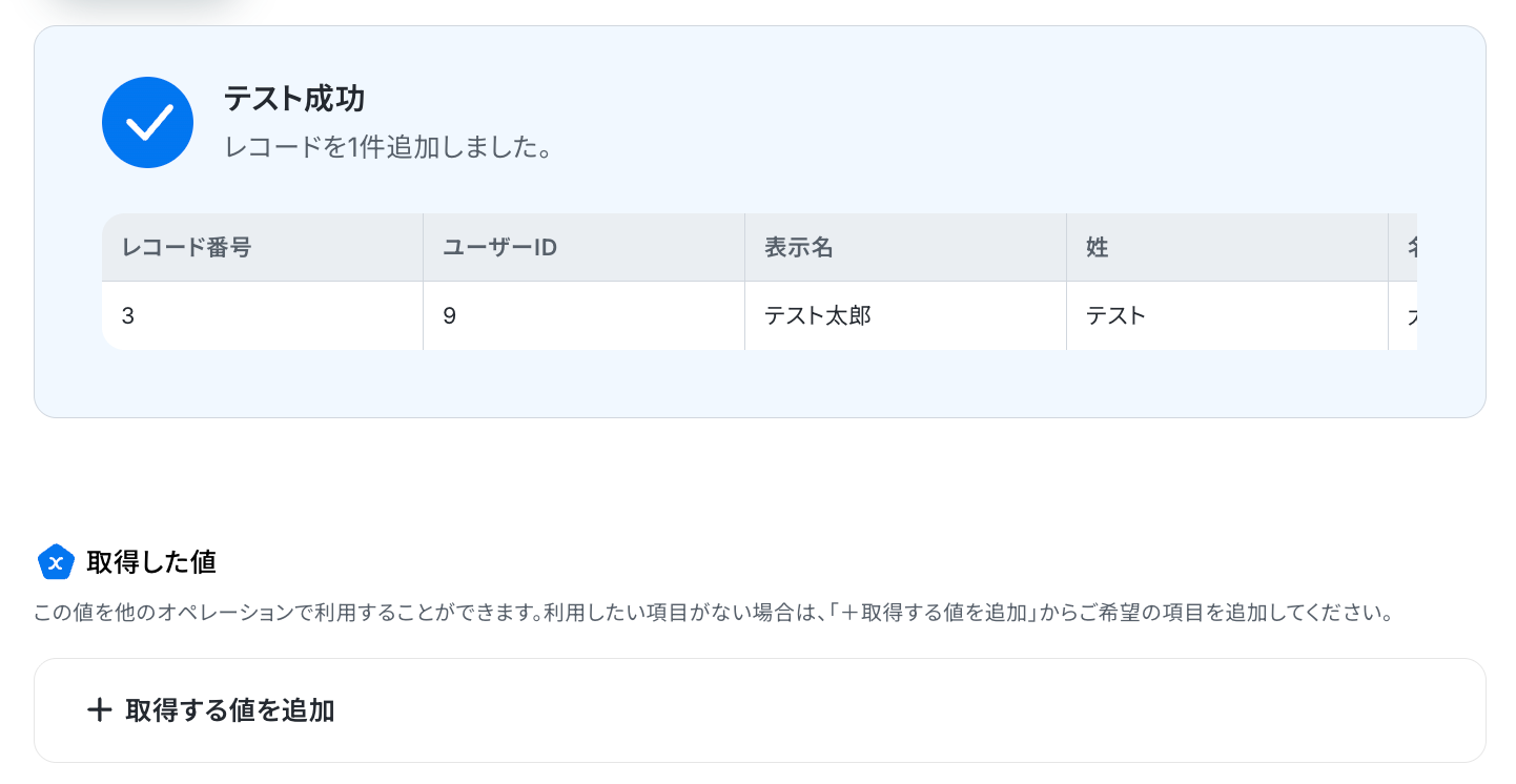 各項目の入力が完了したら「テスト」をクリックして、設定した内容でレコードが追加されるか確認しましょう。