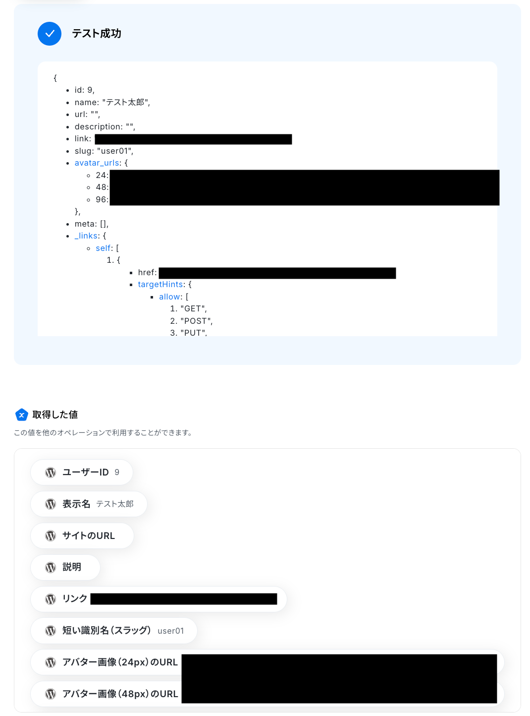 テストに成功すると、WordPress.orgに追加されたユーザーに関する情報が表示されます。