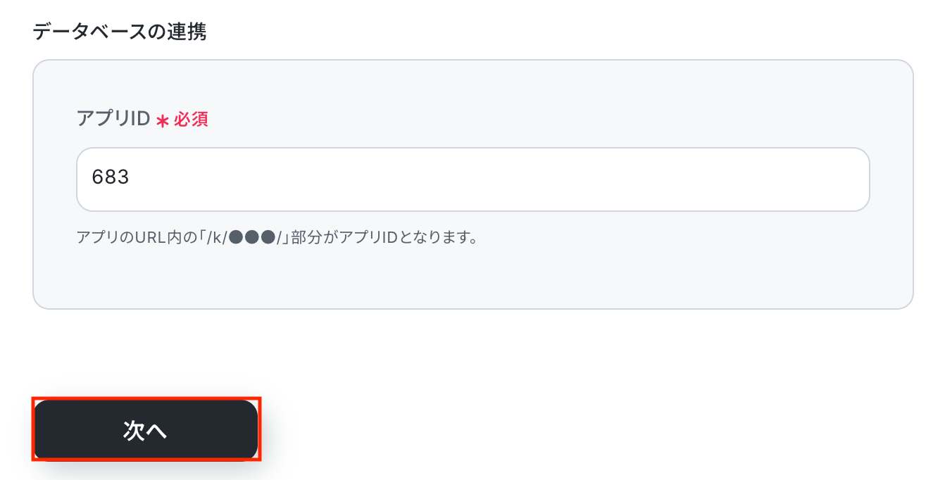 kintoneで連携するアプリの「アプリID」を入力し、「次へ」をクリックしてください。
