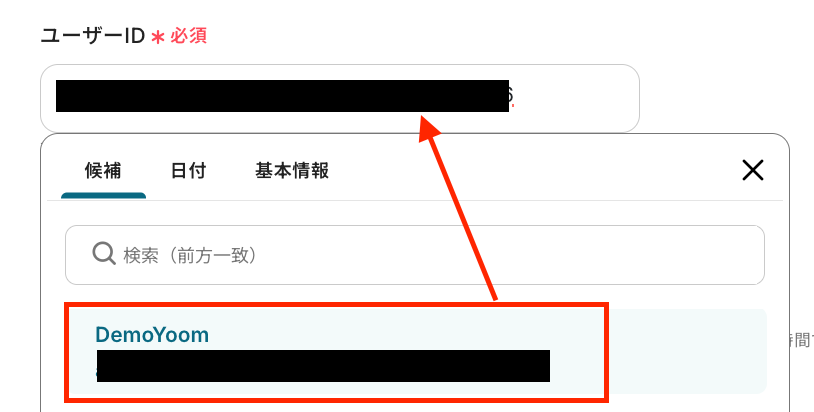 「ユーザーID」:入力欄をクリックして表示される「候補」から選択します。