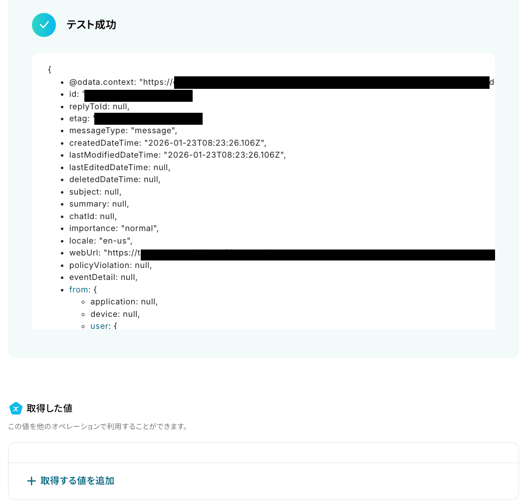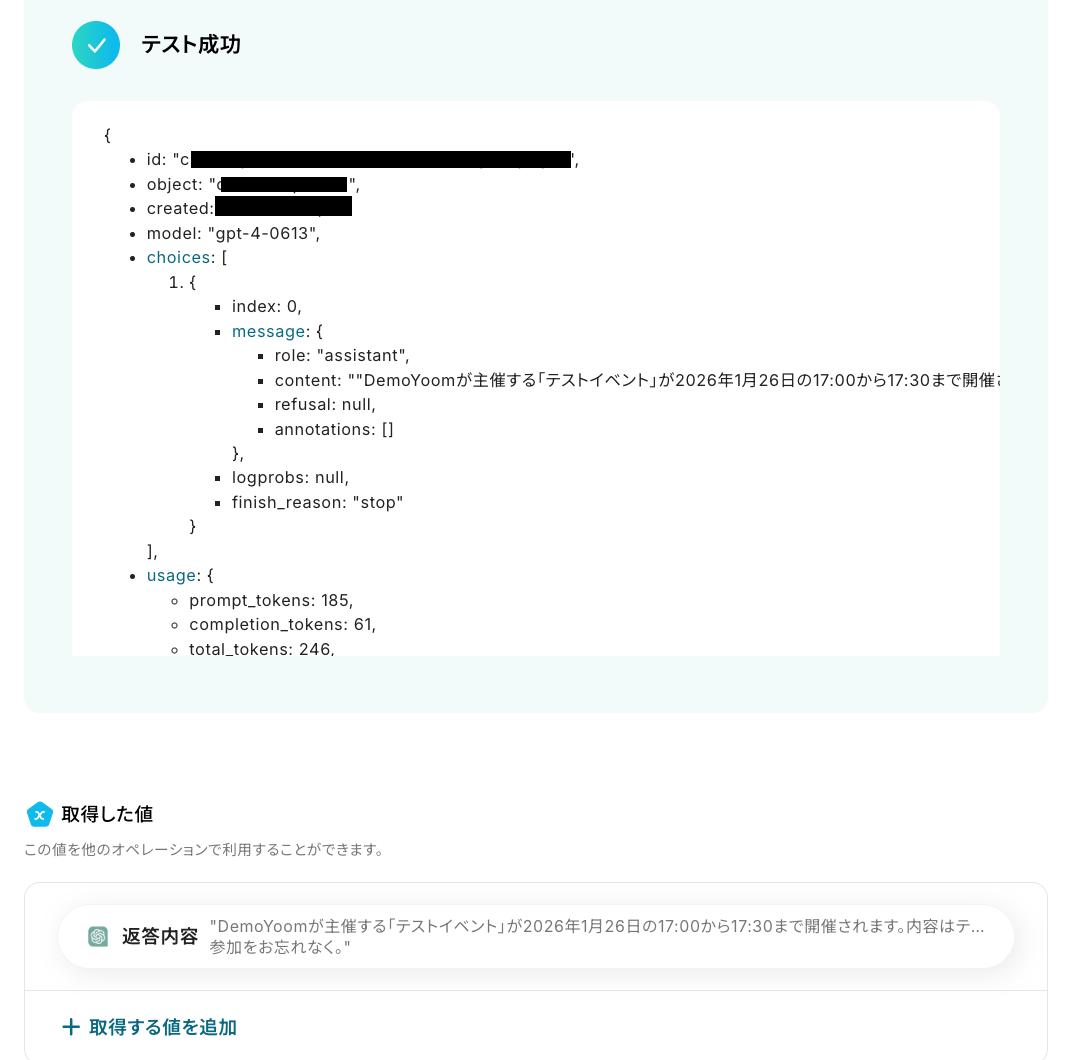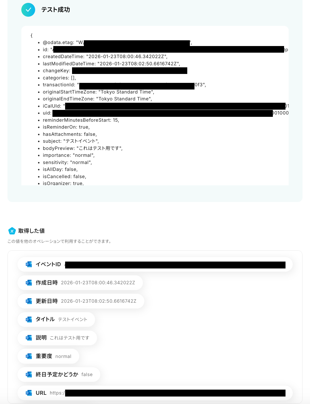 テストに成功すると、先ほど作成したイベント内容が取得した値に表示されます。