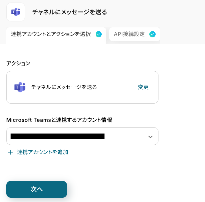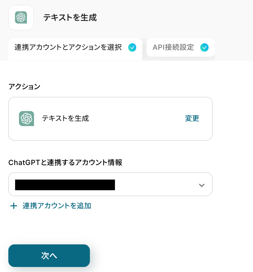 Yoomの画面に戻って、連携アカウントとアクション選択を行いましょう。