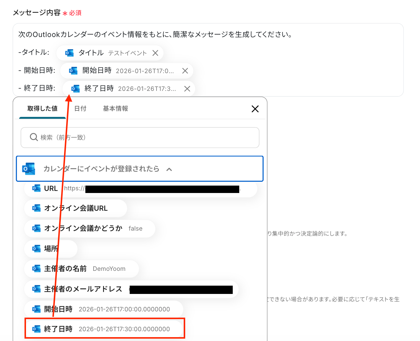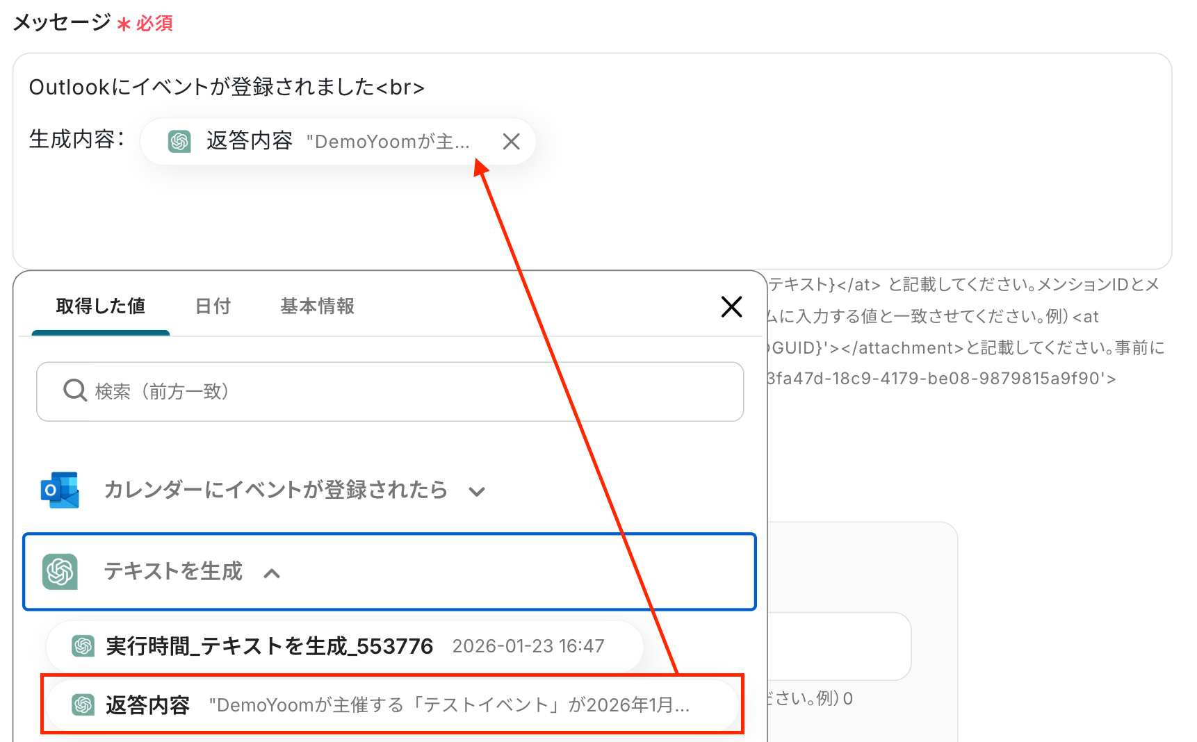 - 次に、オペレーションでChatGPTの「テキストを生成」アクションを設定し、Outlookで取得した予定情報をもとに通知メッセージを作成する