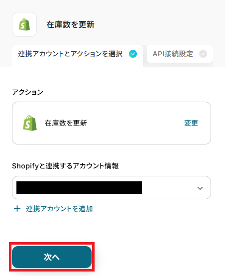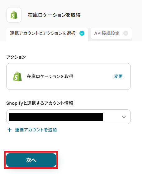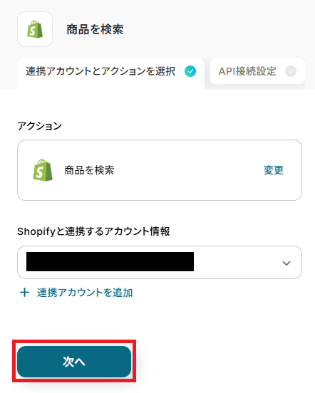 再度、Shopifyと連携するアカウントに間違いがないかを確認し、「次へ」をクリックしましょう。